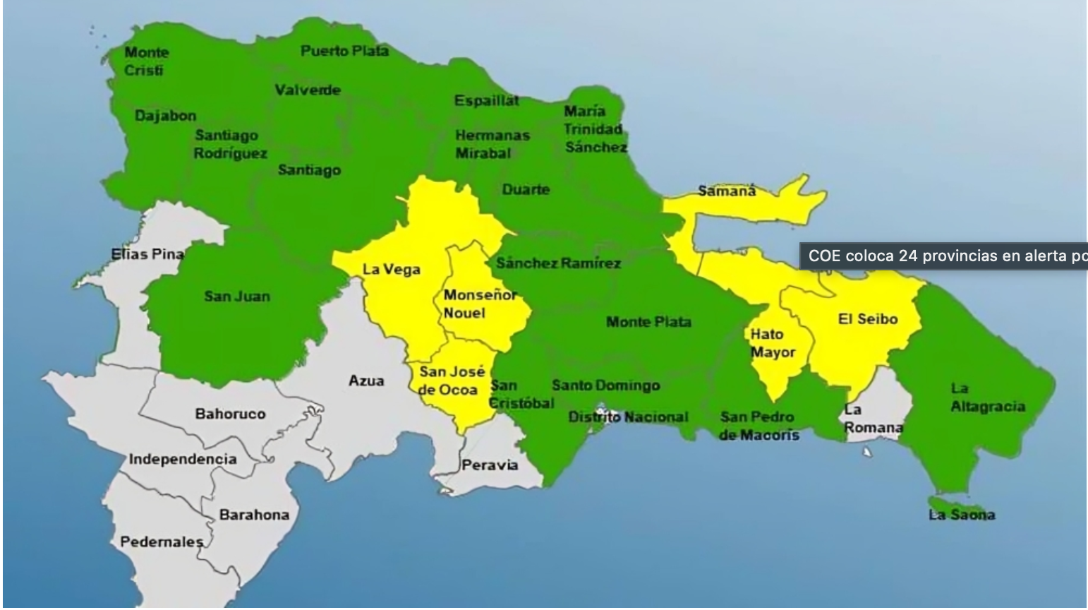De acuerdo con el organismo, seis provincias se encuentran en nivel de alerta amarilla: La Vega, Monseñor Nouel, Samaná, San José de Ocoa, El Seibo y Hato Mayor, ante la posibilidad de crecidas repentinas de ríos, arroyos y cañadas, así como deslizamientos de tierra.