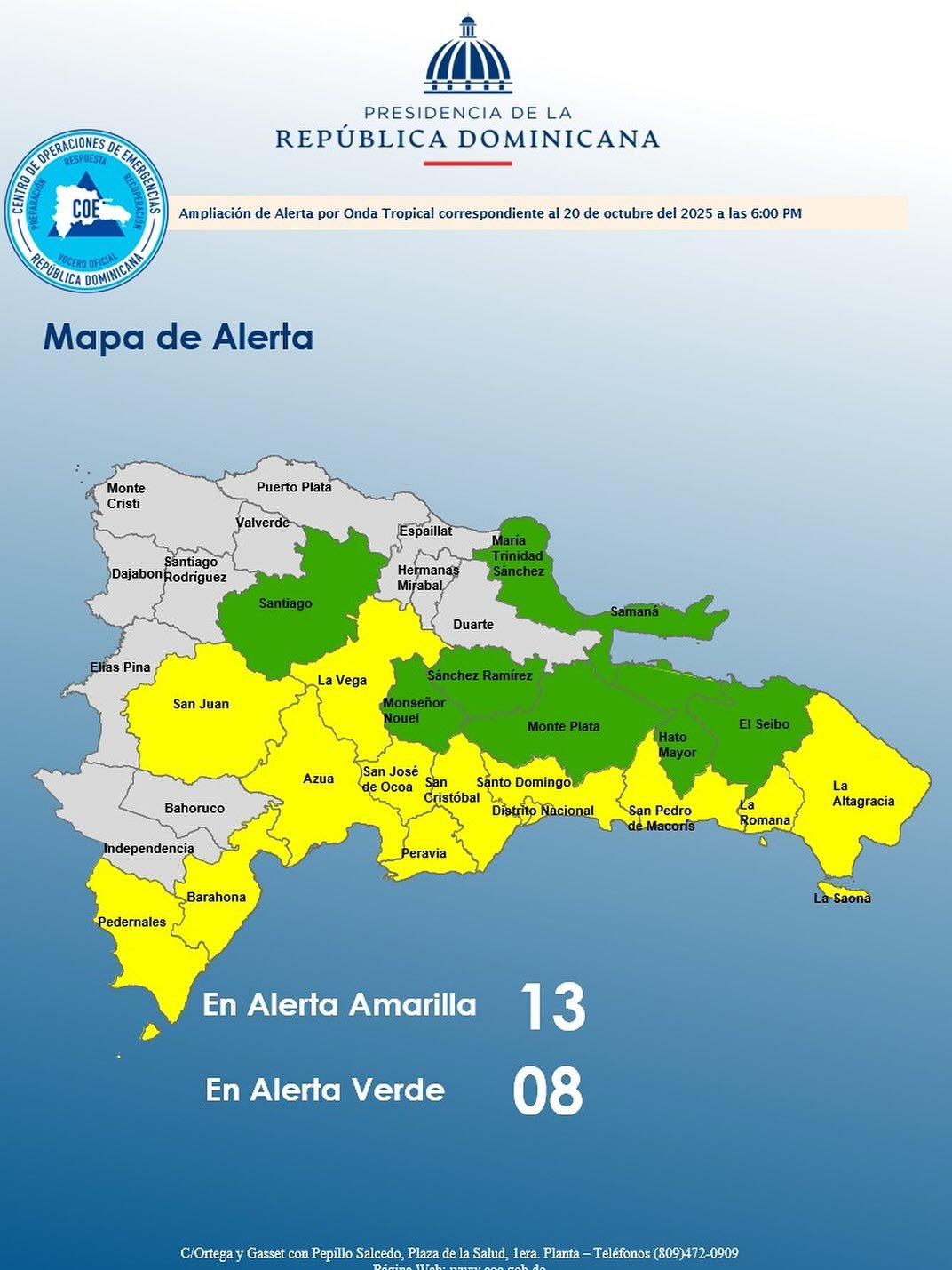 Santo Domingo. — El director del Centro de Operaciones de Emergencias (COE), Juan Manuel Méndez, informó este martes que continúan vigentes los niveles de alerta preventiva en gran parte del territorio nacional, debido a las intensas lluvias provocadas por una onda tropical que sigue incidiendo sobre la República Dominicana.