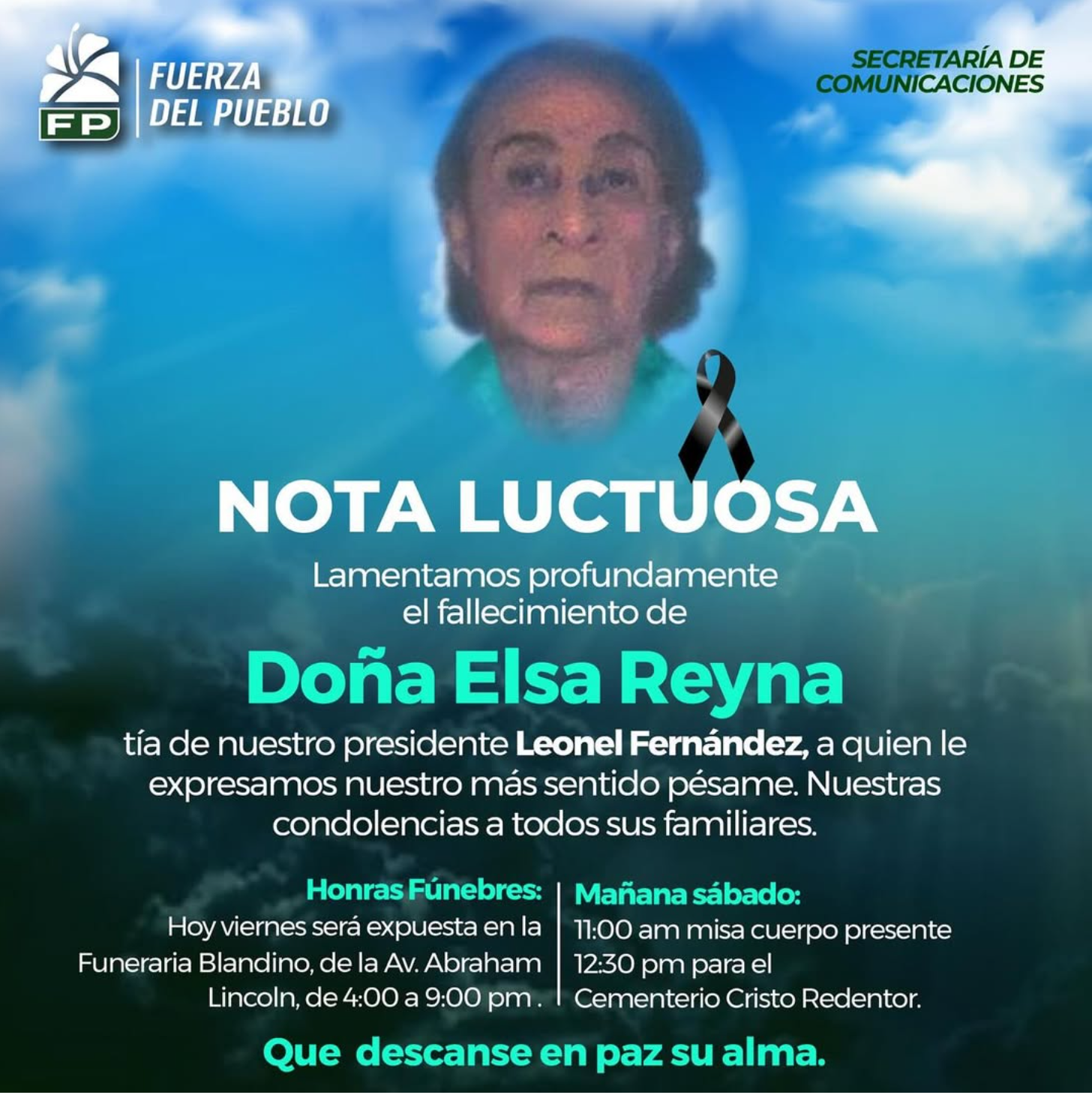 SANTO DOMINGO, REPÚBLICA DOMINICANA. — El partido Fuerza del Pueblo informó este viernes el fallecimiento de doña Elsa Reyna, familiar muy cercana del expresidente Leonel Fernández, hecho que ha generado pesar dentro de la organización política y en el círculo íntimo del exmandatario.